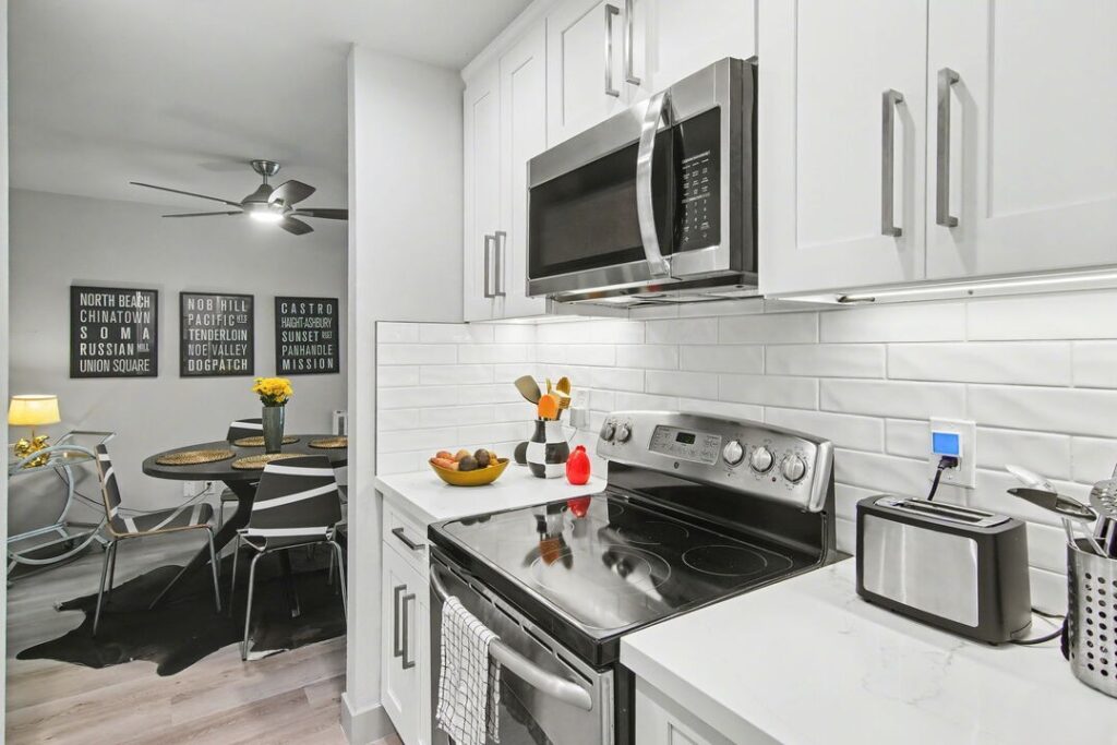 The open living and dining area is anchored by a contemporary kitchen with generous cabinetry, ample counter space, and seamless flow to the main living spaces.
