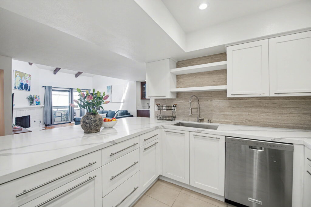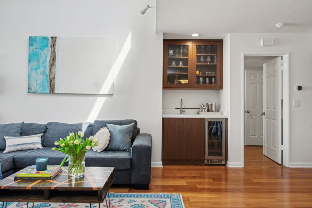 The renovated kitchen features quartz countertops and custom cabinetry with built-in knife and spice drawers. Additionally a mini bar with a refrigerator for added function and style. Sliding doors off the living room leads to a private balcony, offering a quiet outdoor retreat.?