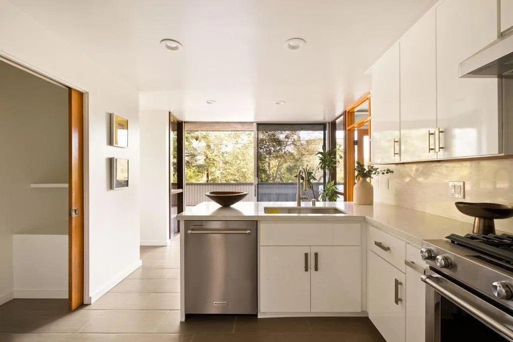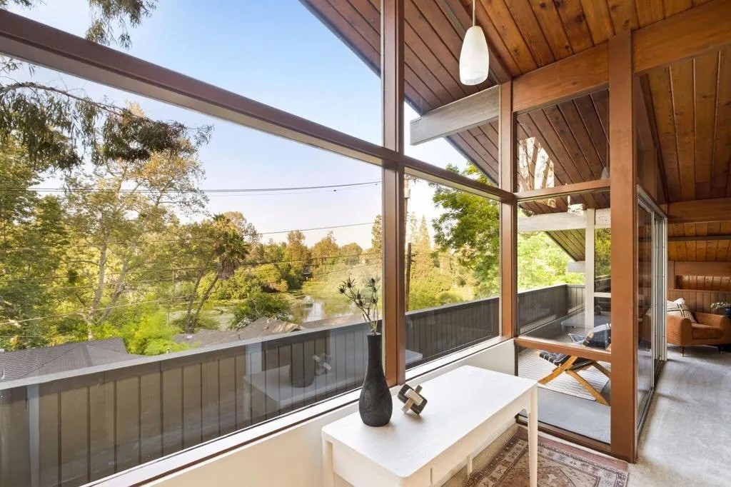 Designed by noted architect John L. Pugsley, this exceptional post and beam residence stands as a testament to mid-century architectural design. Privately situated behind the gates of San Rafael’s Brookmere Enclave, the home offers stunning views of Johnston Lake. Pugsley’s signature style is reflected in the home’s open, airy floor plan, soaring vaulted ceilings, and expansive floor-to-ceiling windows that flood the interiors with natural light.