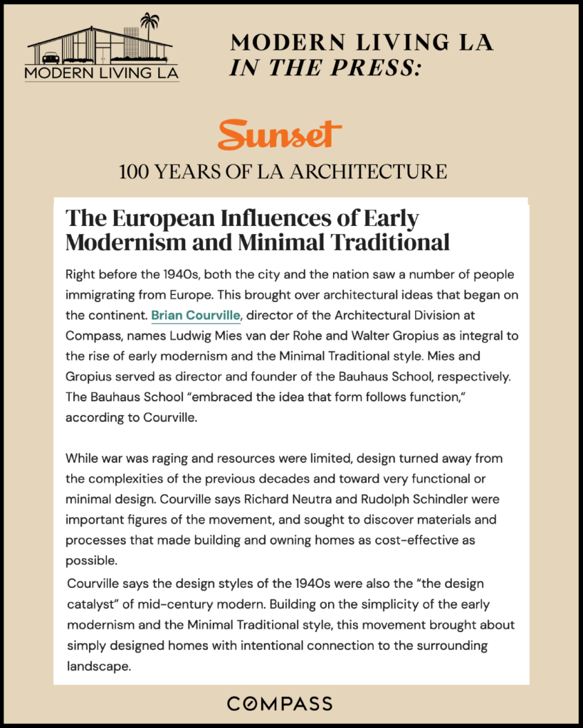 Right before the 1940s, both the city and the nation saw a number of people immigrating from Europe. This brought over architectural ideas that began on the continent. Brian Courville, director of the Architectural Division at Compass, names Ludwig Mies van der Rohe and Walter Gropius as integral to the rise of early modernism and the Minimal Traditional style. Mies and Gropius served as director and founder of the Bauhaus School, respectively. The Bauhaus School “embraced the idea that form follows function,” according to Courville.